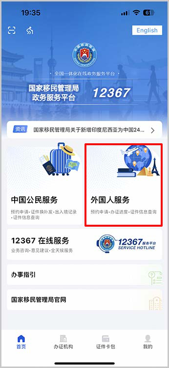 移民局12367を起動するとトップページが表示されます