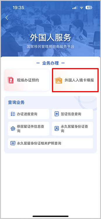 「外国人入境卡填报」をタップします