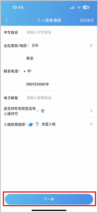 全て入力が終わったら下一步(次へ)ボタンをタップします。