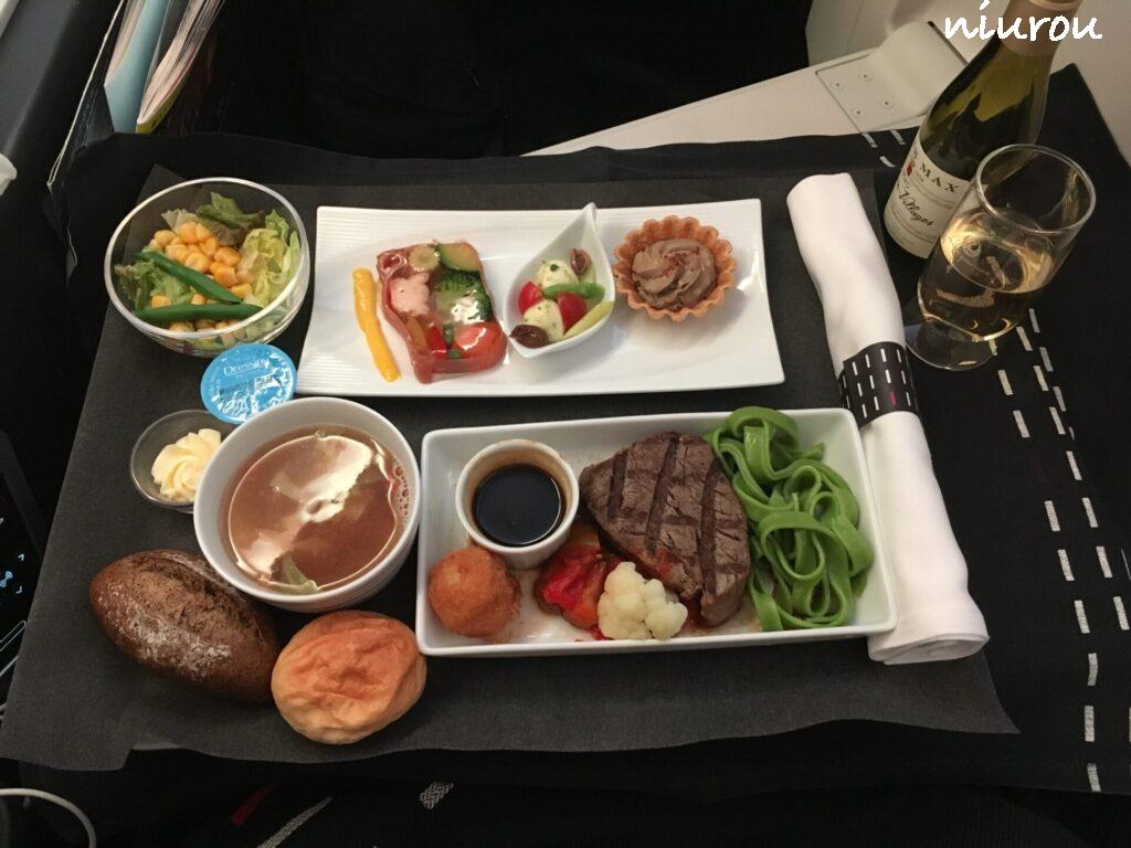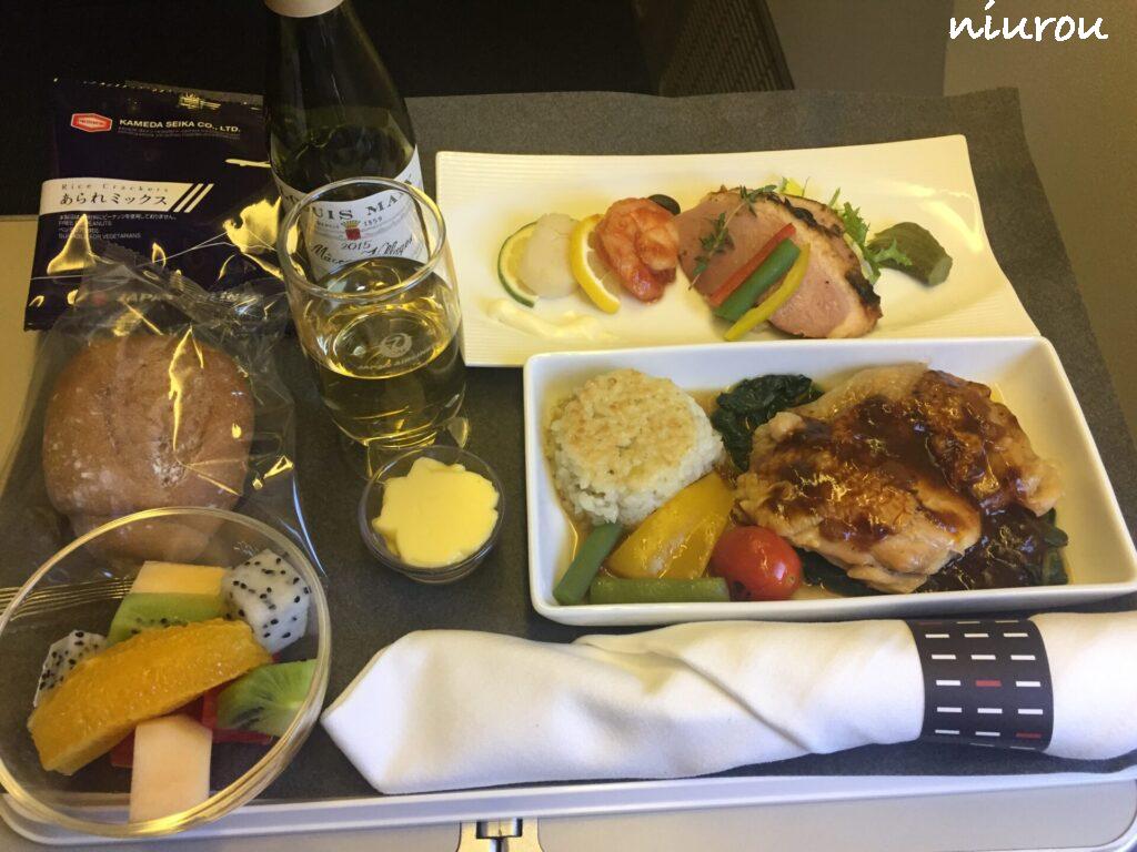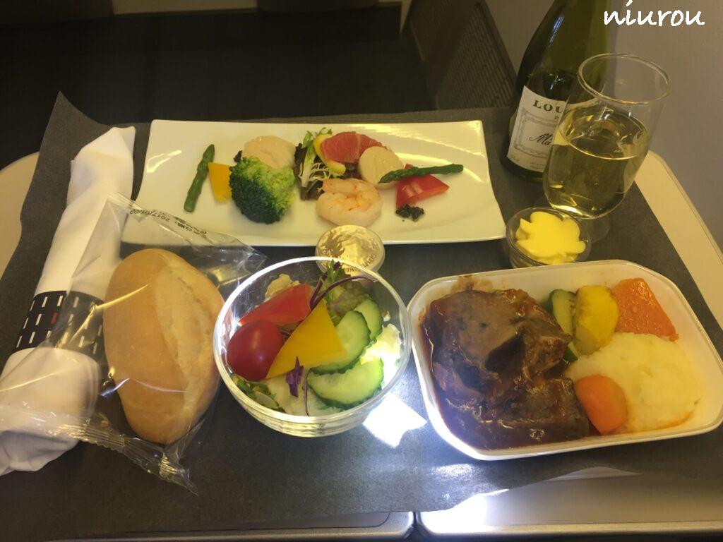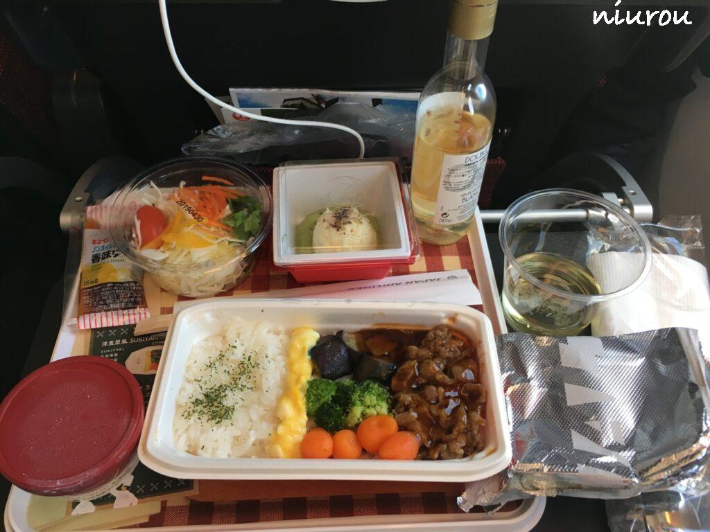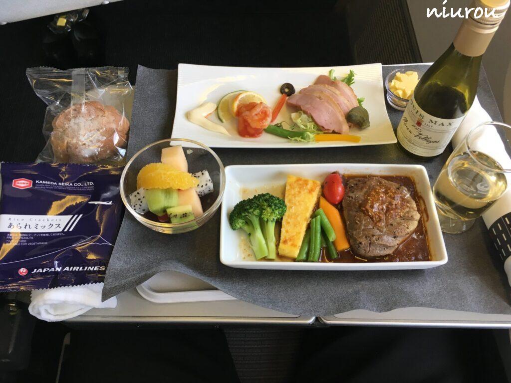 JALグローバルクラブ会員の場合、エコノミーのチケットでもビジネスにアップグレードされることがあります。ビジネスの食事は、美味しいし、量もあるし、お酒もおいしいし、最高です!