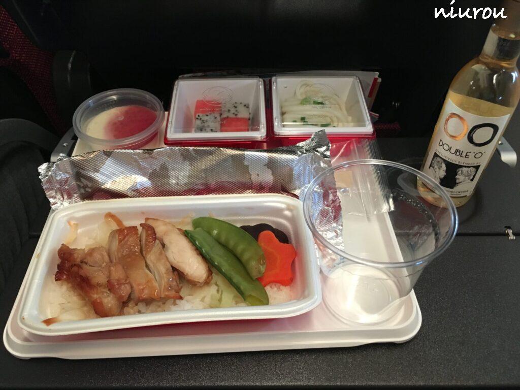 こちらは、エコノミークラスの食事です。ビジネスクラスの食事よりもエコノミークラスの方が、知恵を絞って考えに考えられているメニューのような気がします。