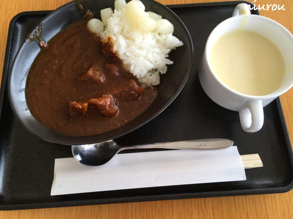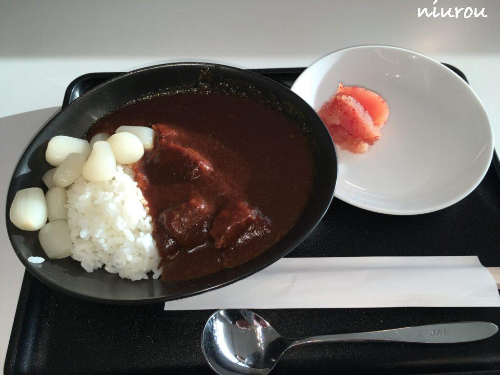 サクララウンジでは、有名なJAL特製ビーフカレーと明太子を食べます。