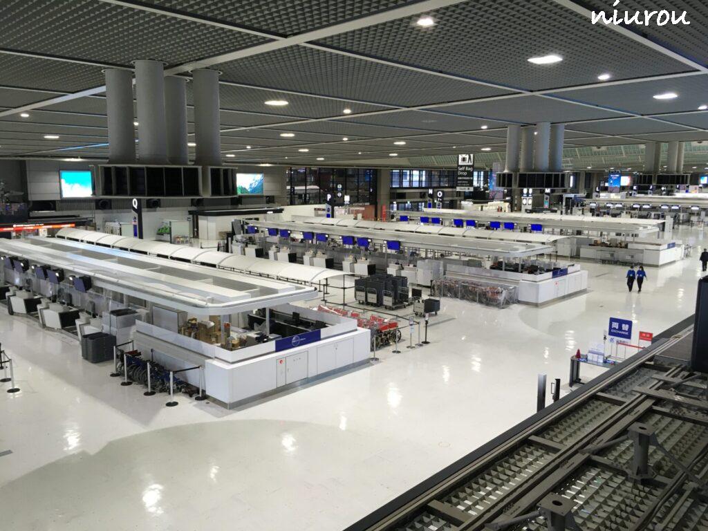 写真には、旅客がほとんど写っていませんが、海外便は運休が多いため、成田空港に旅客がいませんでした。