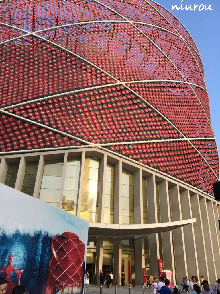 ここは、東湖路にある漢秀劇場です。紅いちょうちんをイメージしてデザインされたと言われています。