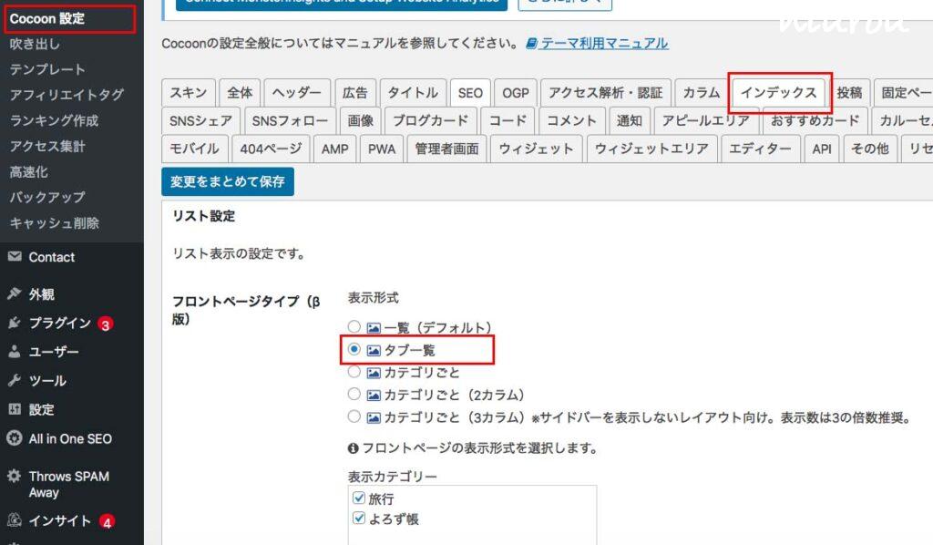 2列に変更するには、Cocoon設定のインデックスタブから設定します。